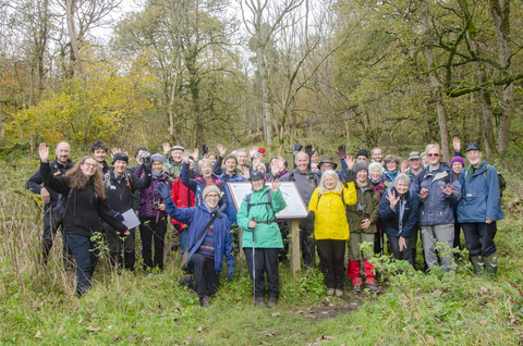 Past and present staff and volunteers posed for a group photo before heading into Grass Wood for a special guided tour