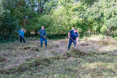 The group take on a wide variety of tasks depending on the reserve and the time of year. Today, eight volunteers were helping to herd two Belted Galloway cattle and then finish raking the reserve’s wildflower meadows. Below is a photo of some of the Harrogate Supporter Team volunteers with two of the volunteers spotting a frog at their feet!