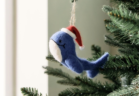 needle felted christmas whale with santa hat