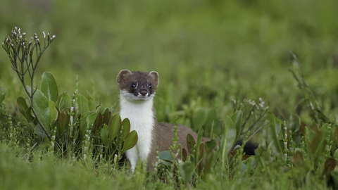 Stoat (Mustela erminea), standing amongst saltmarsh plants, Conwy, June 2012, - Richard Steel/2020VISION
