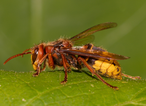 The hornet is a large social wasp that has a brown thorax and brown and yellow stripes on its body, rather than black and yellow. It has an obvious 'waist' between the thorax and abdomen. The similar-looking Asian hornet has recently arrived in the UK, but has a mainly brown abdomen except for one yellow segment. It is smaller than our native hornet.
