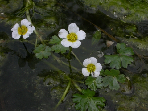 A member of the buttercup family, Common water-crowfoot displays white, buttercup-like flowers with yellow centres. It can form mats in ponds, ditches and streams during spring and summer.