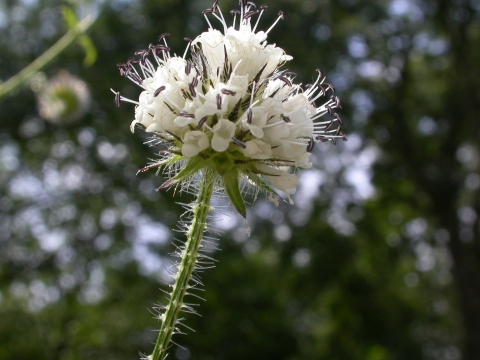 The Small teasel has oval, long-stalked leaves. It bears whitish flowers in a globular cluster atop its branched, prickly stems. The resulting seed heads are also rounded and have long spines that surround the seeds.